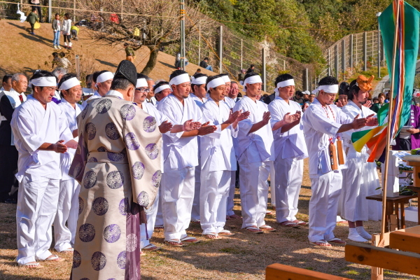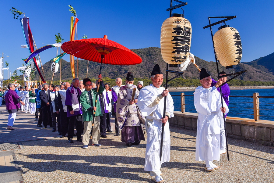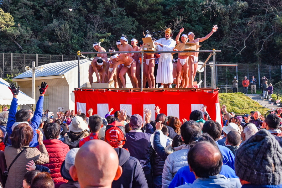 海岸前の広場に到着後、神事が行われて海に入る新成人や厄払いの成人氏子たちがお祓いを受けました。その後、神輿を担いて海岸へ。海からの冷たい風が吹く中、海に入って勇壮に練り歩いてみそぎを行いました。