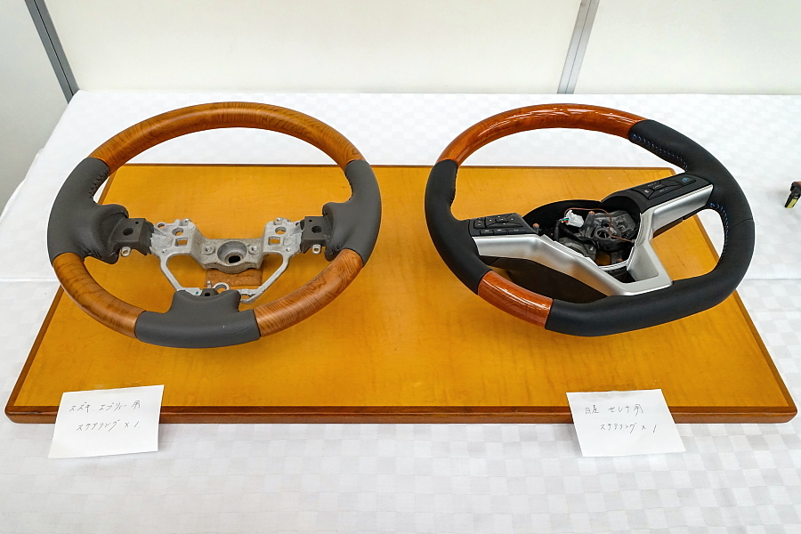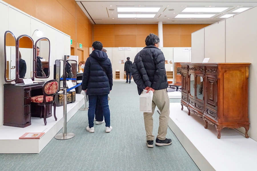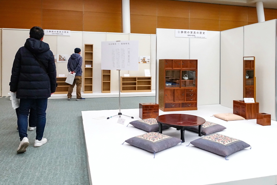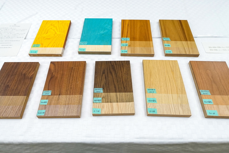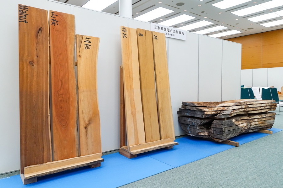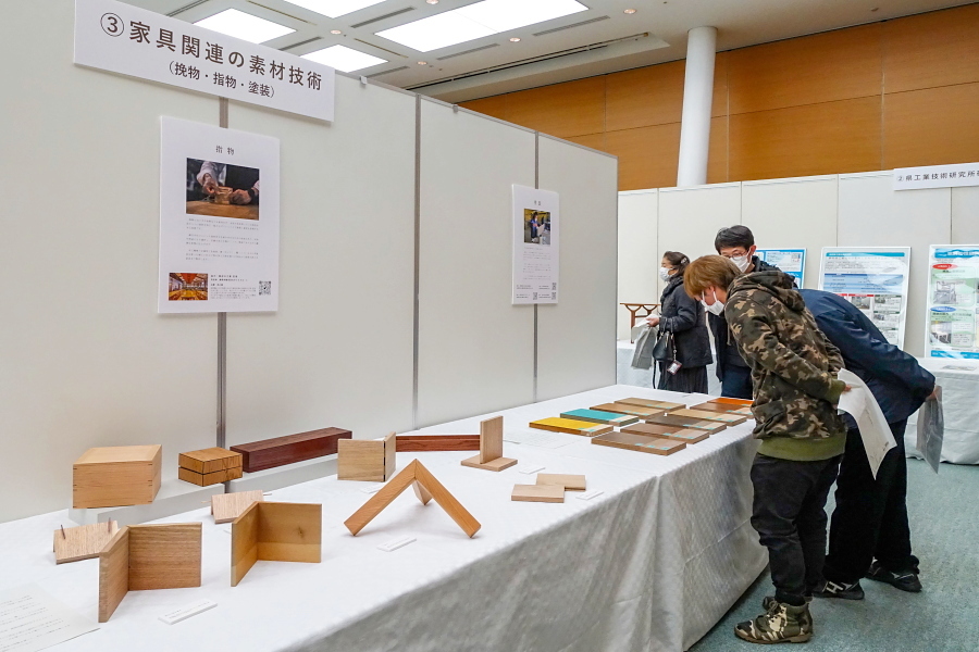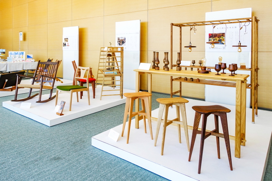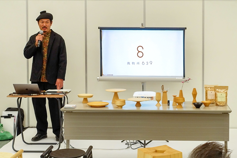 会場の一角では、家具や木工に関する実演・解説が行われました。このうち、挽物技術(ろくろを使って木材を加工)をテーマにした解説では、静岡市で「挽物所639」を営む百瀬聡文さんが登壇して写真や実物を交えながら挽物について分かりやすく説明したほか、手触りからその木工品が何かを当てるクイズもありました。