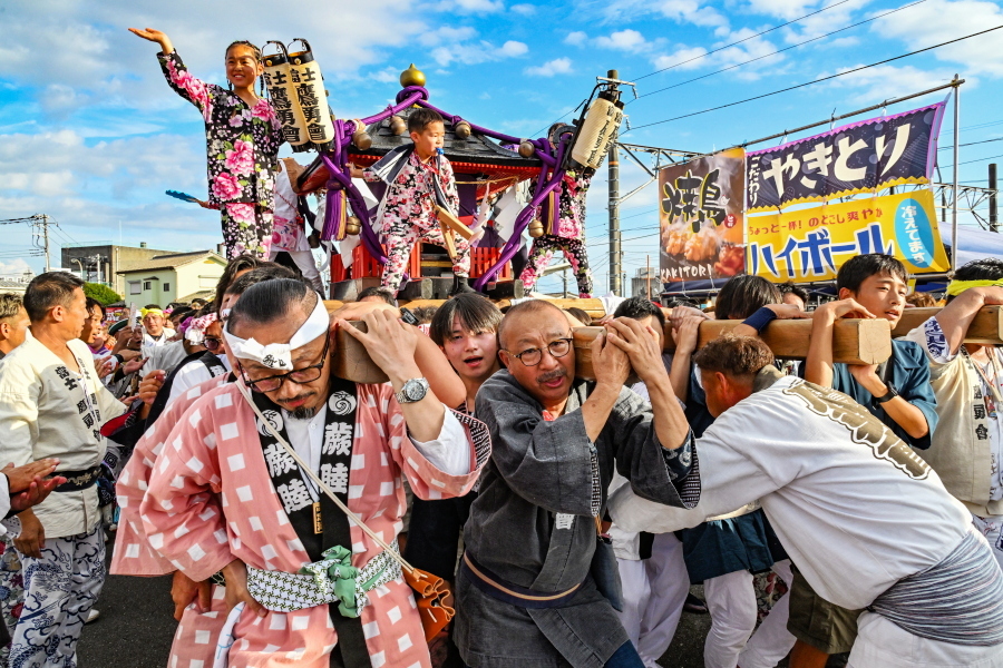 夕方前からは、この祭りの中核をなす鷹岡の神輿団体「富士鷹勇會」による神輿の渡御が行われました。お菓子撒きが行われたあと、出店が並ぶ教習コースを練り歩いていきました。その後、鷹岡の町内に出て商店が並ぶ通りなどを練り歩きました。近隣の神輿団体も多数加わって練り歩きが勇壮に繰り広げられ、盛り上がりを見せていました。