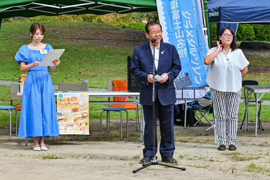 会場にはグルメグランプリにエントリーした富士山周辺のグルメ14店舗が出店して賑わいを見せ、来場者はブースを巡りながら思い思いに買い物や飲食を楽しんでいました。今年度のグランプリを獲得した「富士山メンマ」(竹遊/TakeAsobi)のブースでは試食のメンマが用意されて、来場者の注目を集めていました。