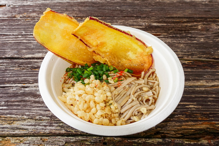 今回のフェスタで私がいただいたものです。順番に芋工房かくたにの「芋天手打ち蕎麦」、富士正酒造の「酒蔵ボロネーゼ」になります。店舗の特徴が出た麺グルメ、じっくり味わえて良かったです。