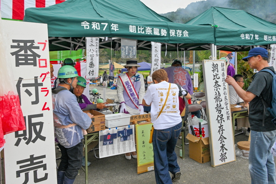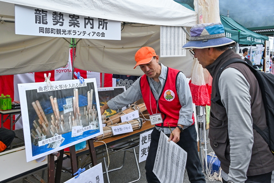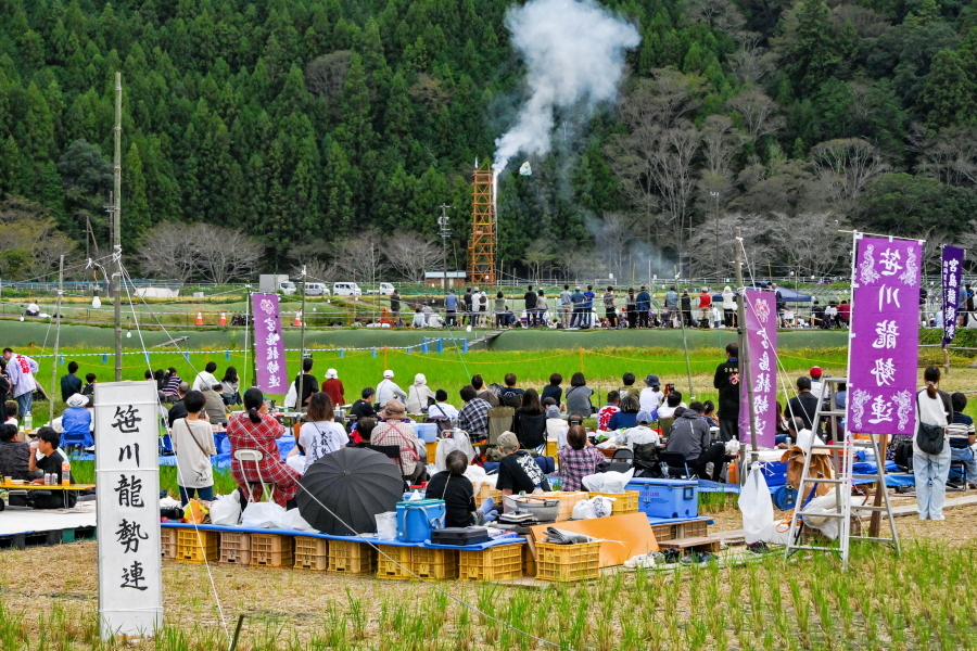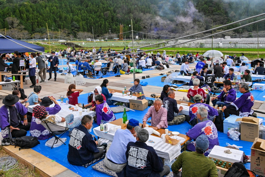 山々に囲まれた田園の一角に設けられた会場には、「連」と呼ばれる龍勢打ち上げチームが宴会をしながら龍勢打ち上げを楽しむ光景が見られたほか、龍勢の実物展示・プログラムやグッズ等の販売コーナー・飲食物の出店があり、賑わいを見せていました。