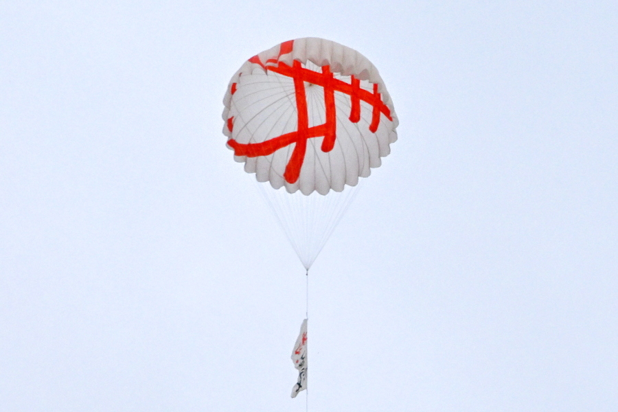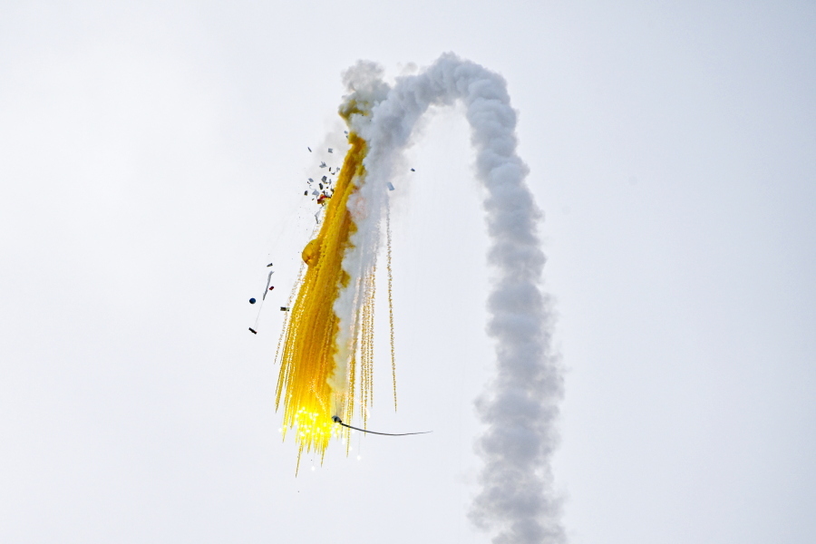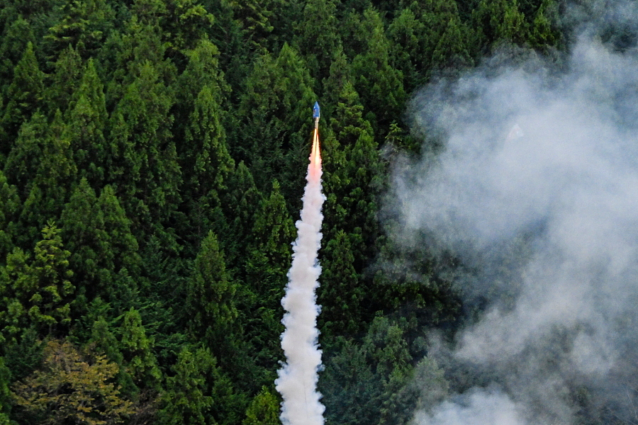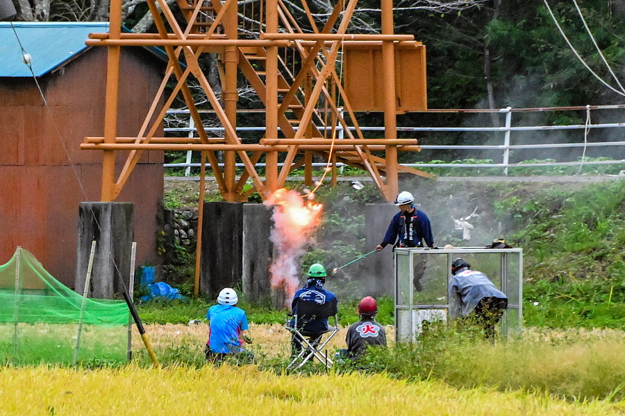 昼間の大龍勢打ち上げ風景です。打ち上げ櫓に龍勢がセットされたあと、口上の読み上げとともに発射されて勢い良く大空に昇っていきます。その風景はまさにロケットです。その後、中の仕掛けが開いて落下傘や色付きの煙が出て、観客の目を楽しませていました。