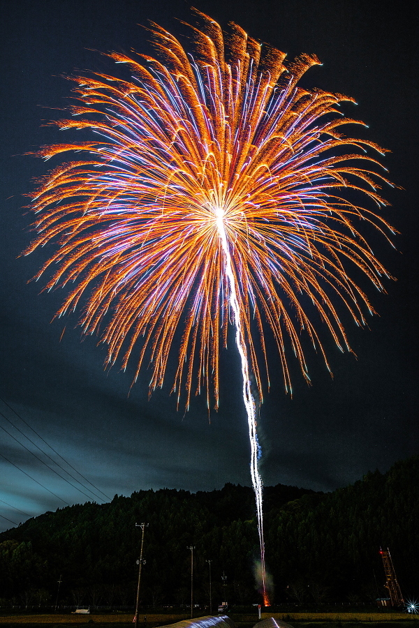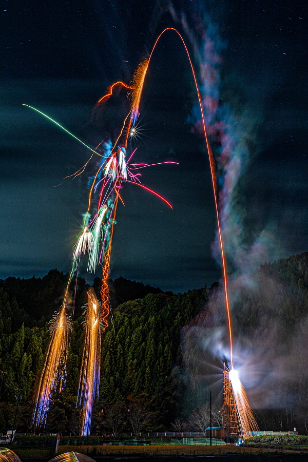 こちらは夜の大龍勢打ち上げ風景です。龍勢は落下傘でゆっくりと降下しながら徐々に花開いていくので、普通の打ち上げ花火と違って長い時間楽しめるのが特徴です。写真は打ち上げから花が開き終わるまでシャッターを開けて、その一部始終を収めています。