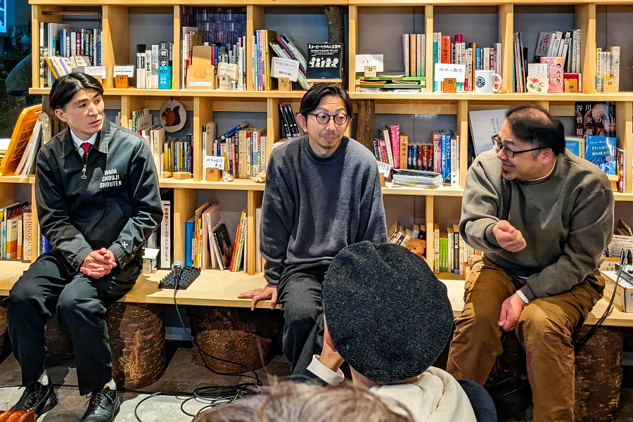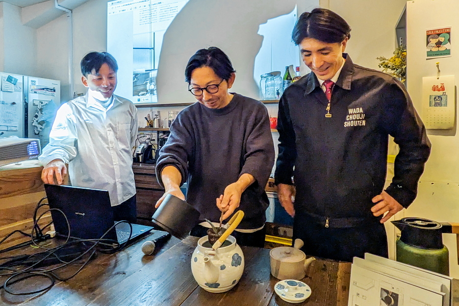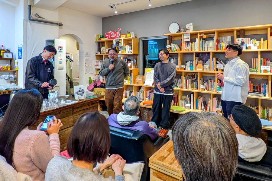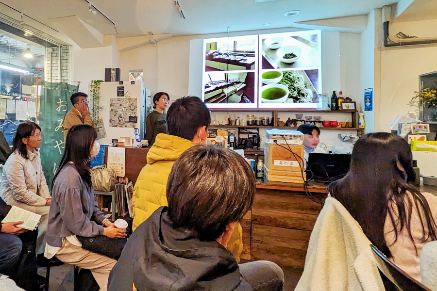 12月14日、拝見場図鑑の刊行を記念したトークイベントが静岡市葵区の北街道商店街にある静岡土産のセレクトショップ「しずおかのひみつ」で開催されました。編集長の小野田英佑さん(きよみ文庫代表)をはじめとする制作メンバーと同図鑑で紹介された3つの茶商(和田長治商店・鈴和商店(茶屋すずわ)・海野謙太郎商店)の方が登壇して、拝見場・茶商についての説明や取材の裏話、これからの展望など、茶商さんが淹れるお茶を味わいながら濃密なトークを存分に楽しめて良かったです。