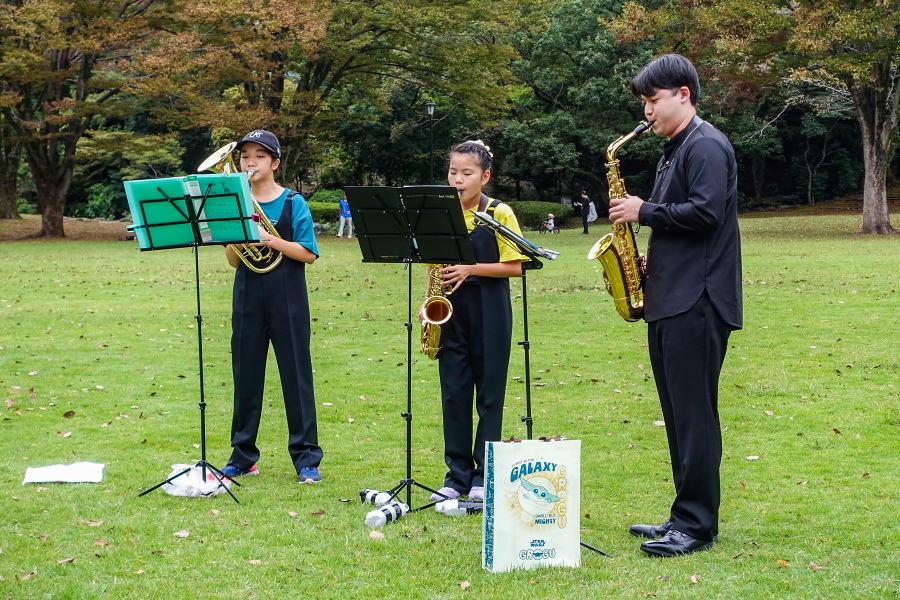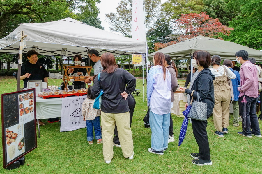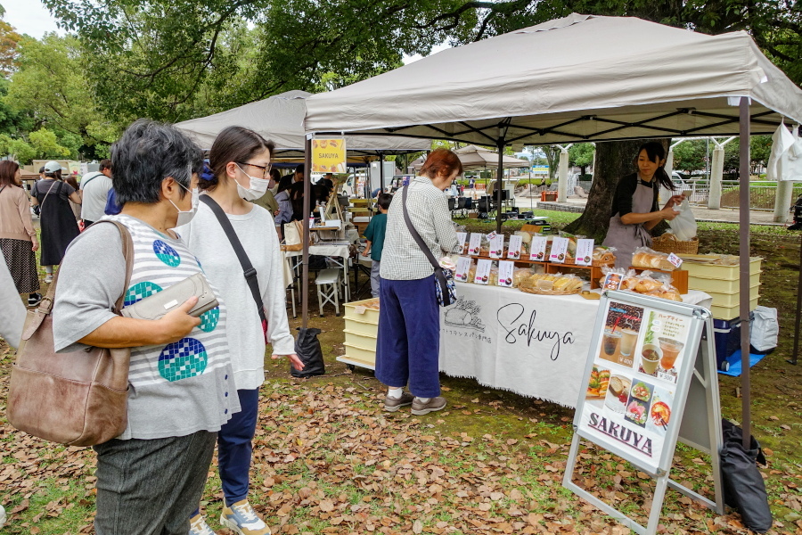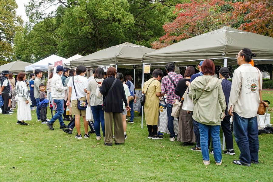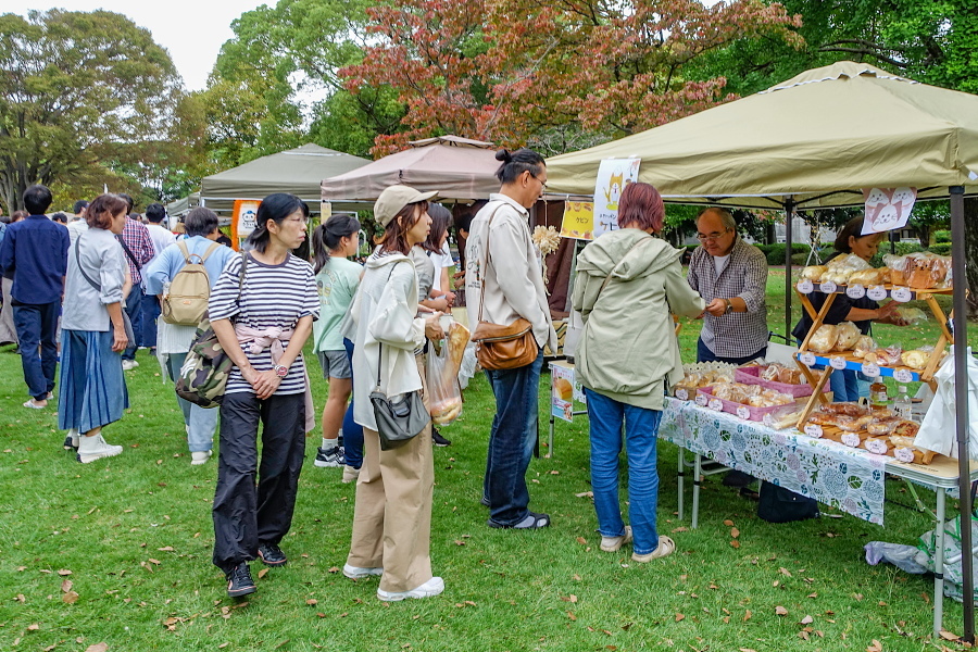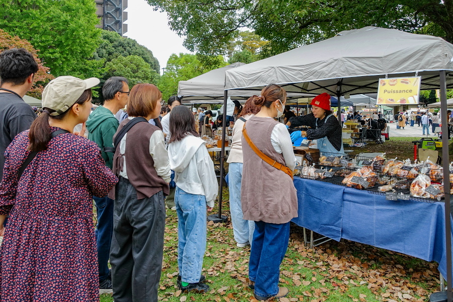 まずは「まちパンマルシェ」から。パン好きなデザイナーによる、地域のパン屋さんの魅力をもっと多くの人に知ってもらいたいという思いから始まったイベントです。公園東側の芝生広場を会場に20店舗ほどが出店して多彩なパンの販売が行われたほか、ドリンクやキッチンカーの出店もあり、多くの来場者で賑わっていました。また、「放課後ミニ吹クラブ」による演奏もありました。