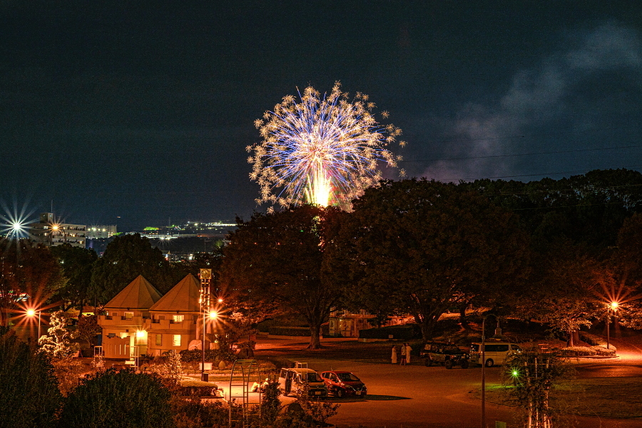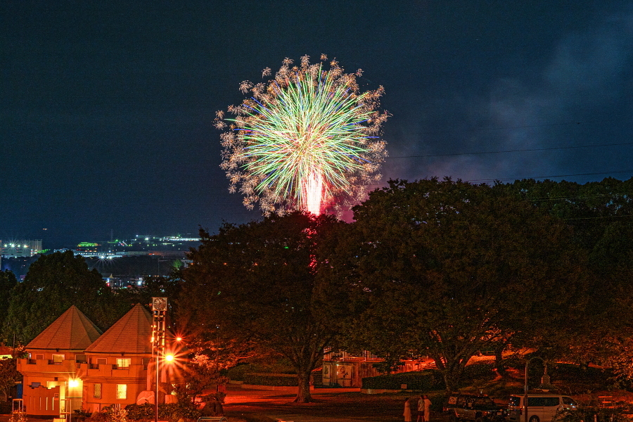 最後のカゴが燃え尽きる頃、祭りのフィナーレを飾る打ち上げ花火が始まりました。あいにくの雨模様ではありましたが、間近で迫力ある花火を楽しめました。